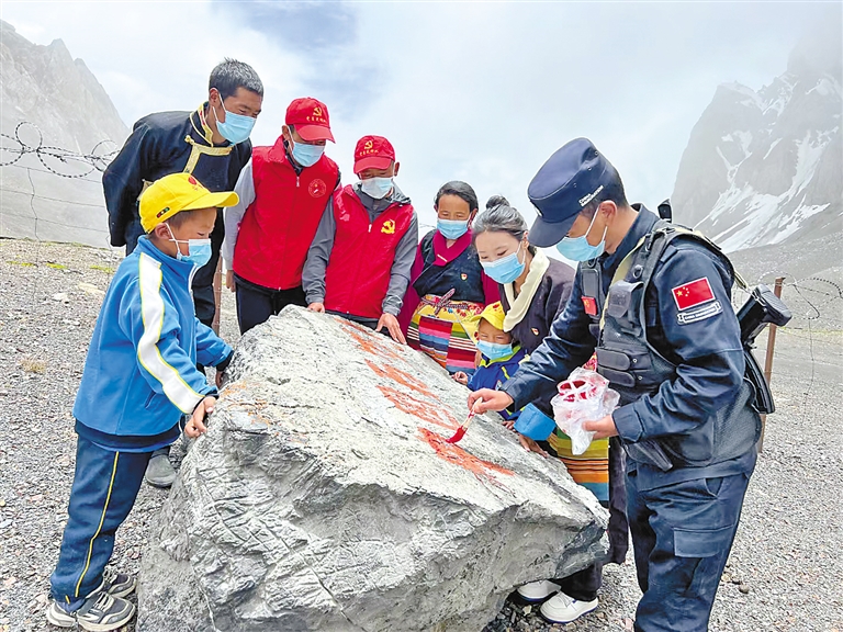 拉青拉山口是吉隆縣貢當鄉(xiāng)境內4座通外山口之一,也是中尼傳統(tǒng)邊貿通道,地形條件極其復雜。李錦一介紹,為增強黨員干部、邊境群眾和社會各界對國家安全、邊境穩(wěn)定的關心關注,貢當鄉(xiāng)創(chuàng)新思路開展“國旗插在最前沿 我為祖國守邊關”系列活動?;顒佣ㄆ谘埲温毟刹俊⒎掂l(xiāng)探親干部、休假返鄉(xiāng)軍人、節(jié)假日在鄉(xiāng)學生等一同參與界樁描紅、同升國旗、邊境巡邏等各類活動,讓更多人參與到守護邊疆的行動中來。