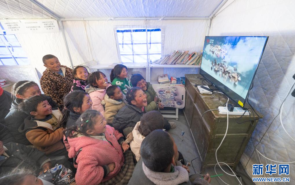 在定日縣長(zhǎng)所鄉(xiāng)嘎布村,孩子們?cè)诳础段饔斡洝罚?月14日攝)。 新華社記者 丁增尼達(dá) 攝