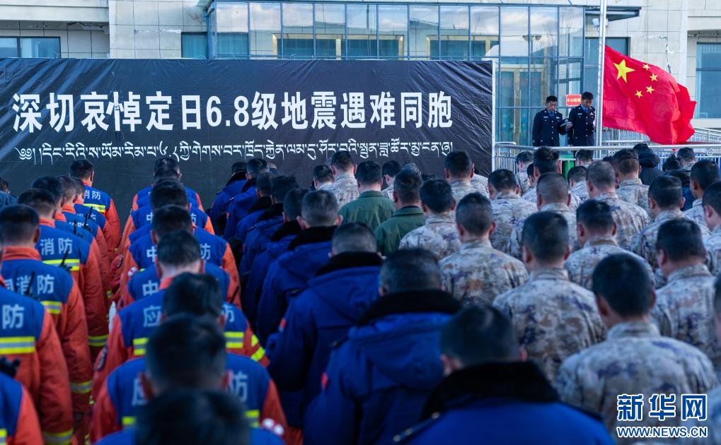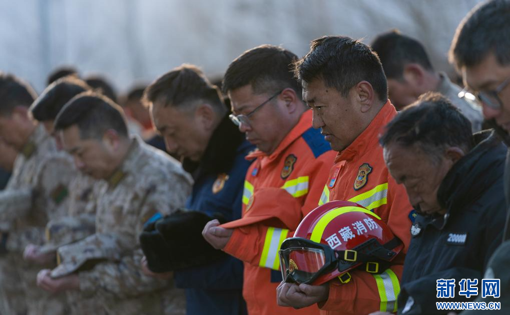 1月13日上午9時(shí)30分,西藏定日6.8級(jí)地震遇難同胞悼念儀式在受災(zāi)最嚴(yán)重的長(zhǎng)所鄉(xiāng)舉行。參與救援的解放軍和武警官兵、消防救援人員、公安民警、醫(yī)護(hù)人員、青年志愿者及有關(guān)企業(yè)員工、干部職工、震區(qū)群眾代表數(shù)百人,脫帽肅立,向遇難同胞默哀3分鐘。 新華社記者 丁增尼達(dá) 攝