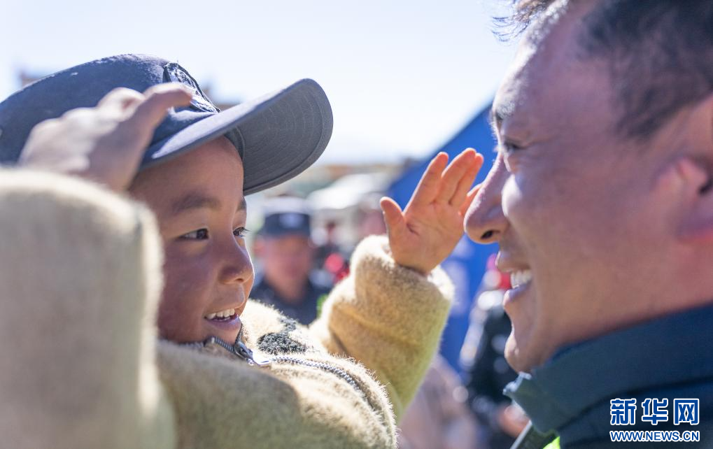 在定日縣長(zhǎng)所鄉(xiāng)嘎布村,一個(gè)孩子戴上移民警察米瑪次仁的帽子敬禮(1月14日攝)。 新華社記者 丁增尼達(dá) 攝