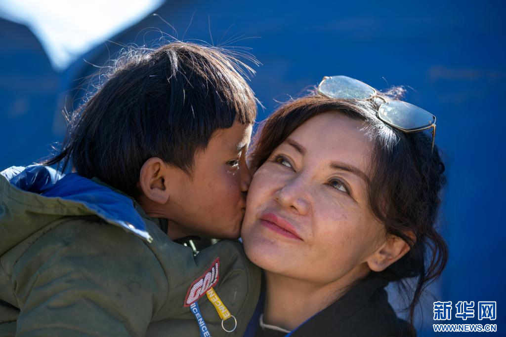 1月11日,在定日縣曲洛鄉(xiāng)措昂村的受災(zāi)群眾安置點(diǎn),一名藏族女孩親吻中國(guó)科學(xué)院心理研究所應(yīng)急心理救援隊(duì)的專(zhuān)家譚惜仁(右)。新華社記者 沈伯韓 攝