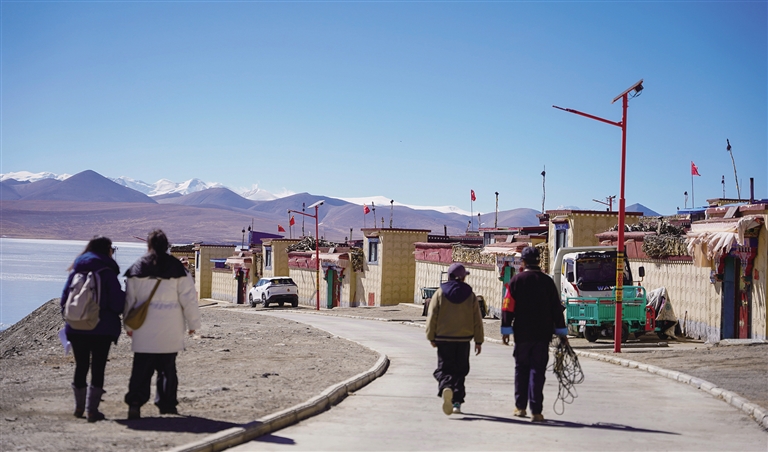 浪卡子縣打隆鎮(zhèn)推瓦村,南部與不丹接壤,邊界線長達(dá)25公里,是世界上海拔最高的純牧業(yè)行政村之一。全村共有40戶人家,153位村民在此生活。2月6日,記者踏入推瓦村,首先映入眼簾的是遠(yuǎn)處的普姆擁措湖,湖面在陽光的照耀下波光粼粼,與錯落有致的雪山相互映襯,構(gòu)成一幅絕美的畫面。沿著平坦的柏油馬路前行,道路兩旁整齊排列的路燈和一排排以溫馨黃色為主色調(diào)的邊境小康房格外引人注目。漫步在臨近冰湖的村路上,悠然愜意之感油然而生,雪山、湖泊、村落與村民們和諧相融,共同繪就了一幅寧靜祥和的鄉(xiāng)村畫卷。