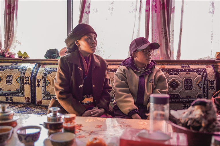 當(dāng)日,天空晴朗,在廣袤無垠、無樹木遮擋的曠野上,稍起一陣疾風(fēng),便會揚起一層薄薄的黃沙。從村委會出發(fā),沿著冰湖畔的水泥小路前行,很快就來到了村民倫珠曲珍的家。一進(jìn)屋,厚實的木門便將凜冽的寒風(fēng)擋在了門外?!翱煺堖M(jìn),這幾天風(fēng)沙有點大,普莫雍措都沒以前藍(lán)了?!眰愔榍湟贿呹P(guān)門一邊熱情地笑著說道。