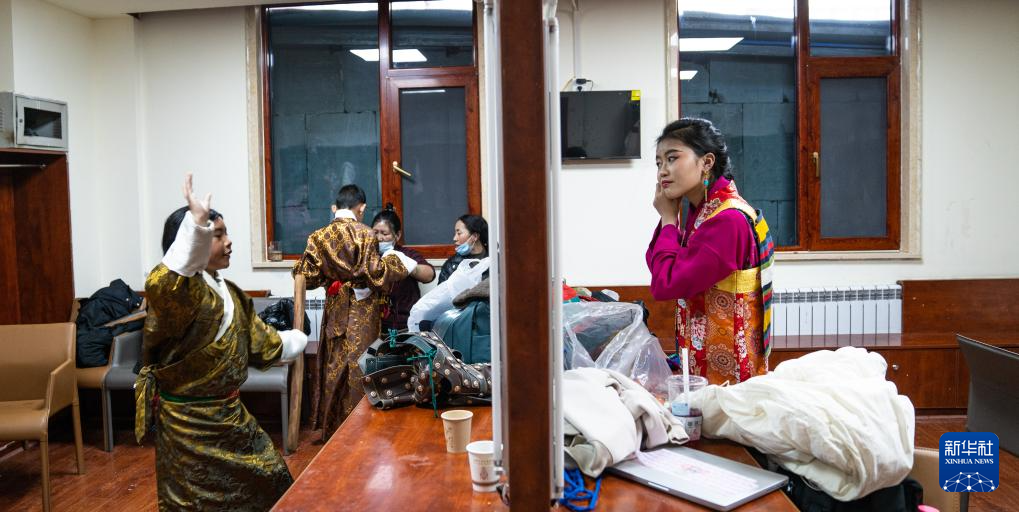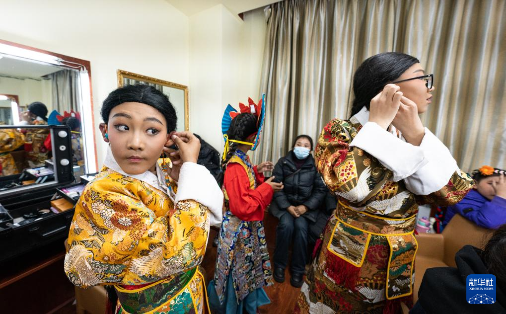 小演員在準(zhǔn)備演出舞臺劇藏戲《頓月頓珠》(2月11日攝)。新華社記者 丁增尼達(dá) 攝