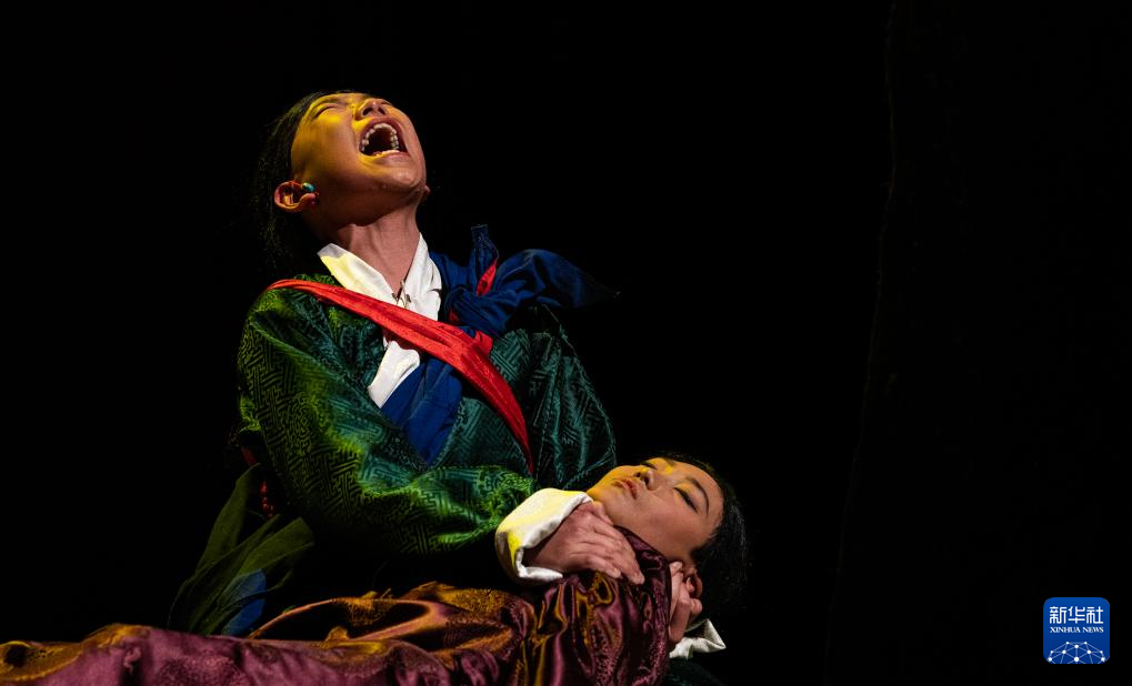 西藏首部少兒舞臺劇藏戲《頓月頓珠》演出現(xiàn)場;羅桑朗覺(右)飾演“頓月”,旦增夢朗(左)飾演“頓珠”(2月11日攝)。新華社記者 丁增尼達(dá) 攝