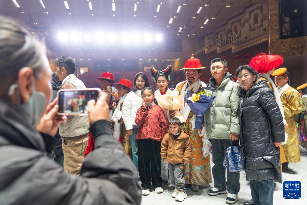 演出結(jié)束后小演員們與家人合影留念(2月11日攝)。新華社記者 丁增尼達(dá) 攝