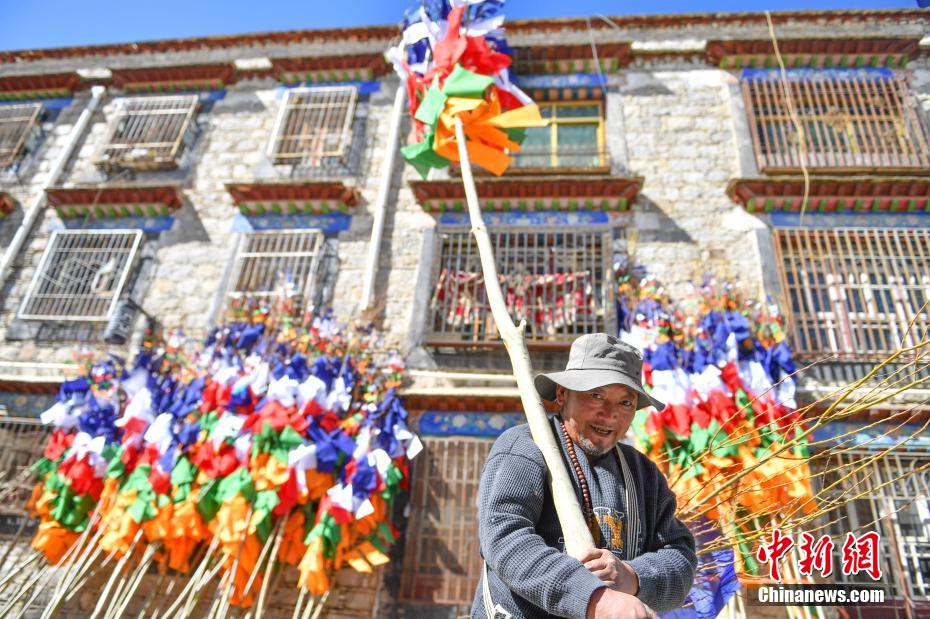 臨近藏歷新年,2月16日,在西藏拉薩街頭,農(nóng)牧民正縫制五彩經(jīng)幡樹(shù)。五彩經(jīng)幡樹(shù)是藏族民眾在藏歷新年前必備的年貨之一。藏歷新年期間,藏族民眾會(huì)選擇一個(gè)良辰吉日,為自家的房頂更換五彩經(jīng)幡樹(shù),祈求新的一年里五谷豐登,吉祥如意。圖為2月16日,來(lái)自尼木縣的普瓊扛著五彩經(jīng)幡樹(shù)。貢確 攝