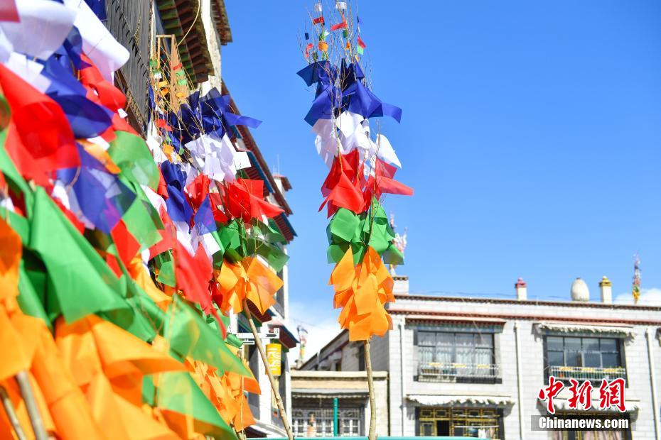 臨近藏歷新年,2月16日,在西藏拉薩街頭,農(nóng)牧民正縫制五彩經(jīng)幡樹(shù)。五彩經(jīng)幡樹(shù)是藏族民眾在藏歷新年前必備的年貨之一。藏歷新年期間,藏族民眾會(huì)選擇一個(gè)良辰吉日,為自家的房頂更換五彩經(jīng)幡樹(shù),祈求新的一年里五谷豐登,吉祥如意。圖為2月16日,普瓊在給顧客展示五彩經(jīng)幡樹(shù)。貢確 攝