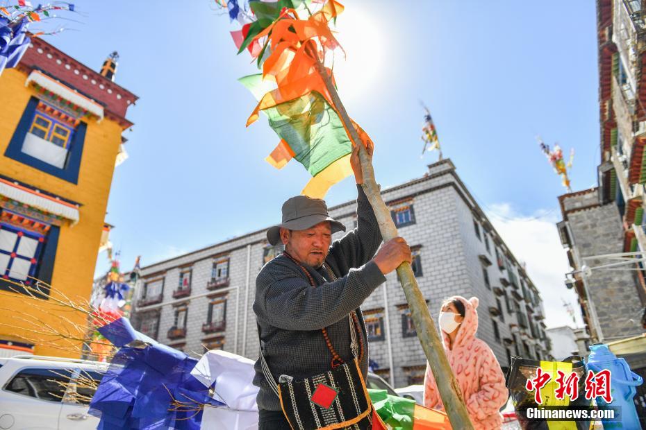 臨近藏歷新年,2月16日,在西藏拉薩街頭,農(nóng)牧民正縫制五彩經(jīng)幡樹(shù)。五彩經(jīng)幡樹(shù)是藏族民眾在藏歷新年前必備的年貨之一。藏歷新年期間,藏族民眾會(huì)選擇一個(gè)良辰吉日,為自家的房頂更換五彩經(jīng)幡樹(shù),祈求新的一年里五谷豐登,吉祥如意。圖為2月16日,拉薩市民正在挑選購(gòu)買(mǎi)五彩經(jīng)幡樹(shù)。貢確 攝