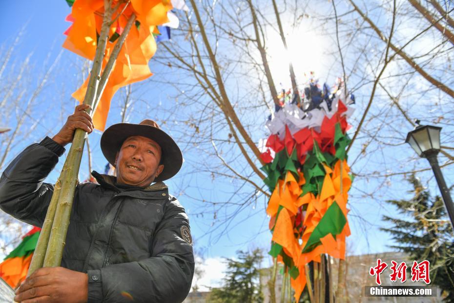臨近藏歷新年,2月16日,在西藏拉薩街頭,農(nóng)牧民正縫制五彩經(jīng)幡樹(shù)。五彩經(jīng)幡樹(shù)是藏族民眾在藏歷新年前必備的年貨之一。藏歷新年期間,藏族民眾會(huì)選擇一個(gè)良辰吉日,為自家的房頂更換五彩經(jīng)幡樹(shù),祈求新的一年里五谷豐登,吉祥如意。圖為2月16日,頓珠扛著五彩經(jīng)幡樹(shù)。貢確 攝
