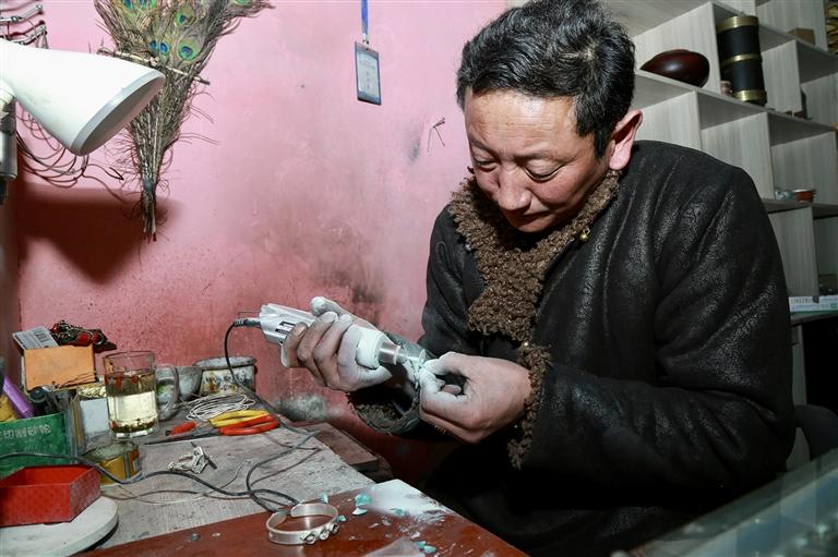 “叮叮當(dāng)當(dāng)……”近日,記者走進墨竹工卡縣尼瑪江熱鄉(xiāng)宗雪村,被一陣短促而有力的敲打聲吸引。循聲而入,記者來到恰扎飾品加工店,展示架上琳瑯滿目的首飾讓人目不暇接:阿吉祖玉、銀手鐲、銀戒指、銀碗……