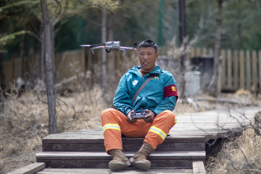 拉薩南山公園園區(qū)護林員扎西曲培正在操控?zé)o人機(3月20日攝)。新華社記者姜帆 攝