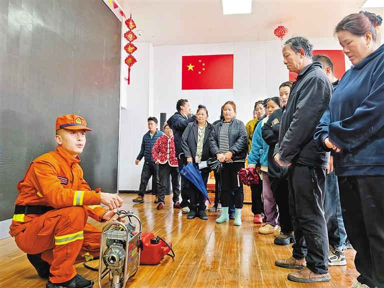 圖為消防員向當?shù)厝罕娭v解消防器材的使用方法。記者 楊小娟 通訊員 蔡安 攝