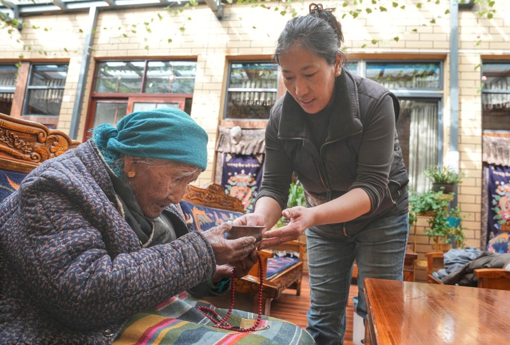 孫媳婦在給玉珍奶奶敬茶(3月12日攝)。新華社記者 晉美多吉 攝