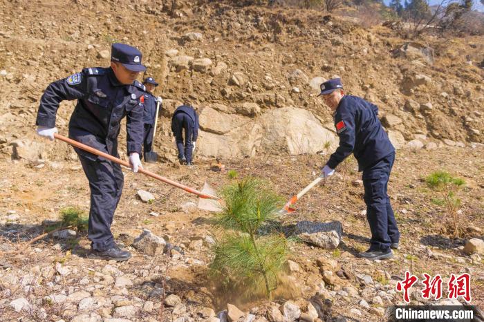 圖為民警揮鍬鏟土栽種樹(shù)苗。李錦輝 攝