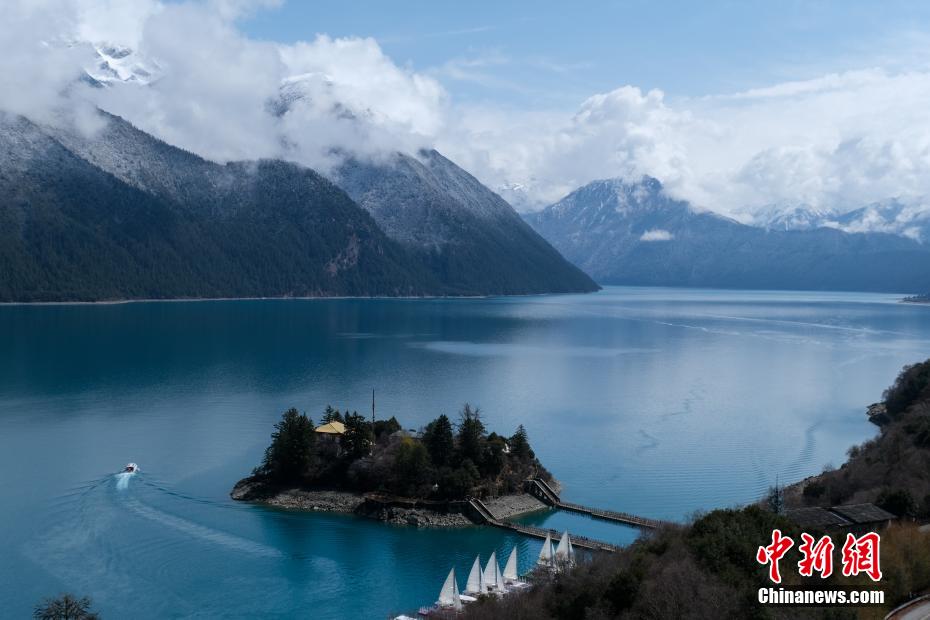 巴松錯位于西藏林芝工布江達縣境內(nèi),地處巴河上游的高山峽谷中,是西藏首個自然風景類國家5A級旅游景區(qū)。4月5日,巴松錯迎來一場春雪,雪后四周原始森林猶如蒙上潔白面紗,湖面宛如一面藍寶石鑲嵌其中,風光如畫。圖為4月5日,游客乘船游覽巴松錯。中新社記者 江飛波 攝
