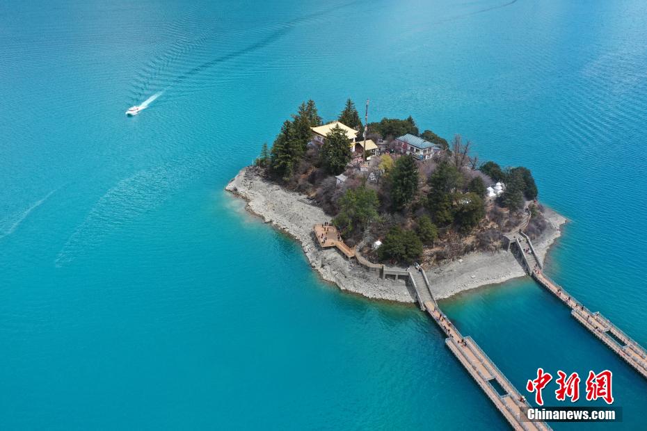 4月6日,西藏林芝工布江達(dá)縣巴松措景區(qū)游人如織。春日里,湛藍(lán)湖水與巍峨雪山相映成趣,游客游玩湖心島或乘船游覽,沉醉在這湖光山色中。圖為巴松措里的游船。(無人機(jī)照片)中新社記者 貢嘎來松 攝