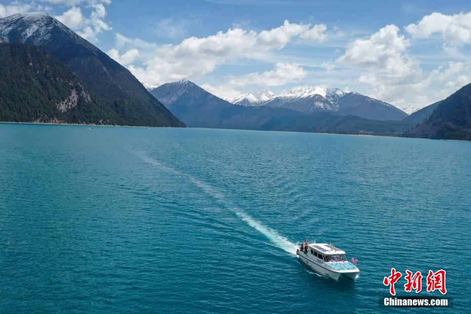 4月6日,西藏林芝工布江達(dá)縣巴松措景區(qū)游人如織。春日里,湛藍(lán)湖水與巍峨雪山相映成趣,游客游玩湖心島或乘船游覽,沉醉在這湖光山色中。圖為巴松措里的游船。中新社記者 貢嘎來松 攝