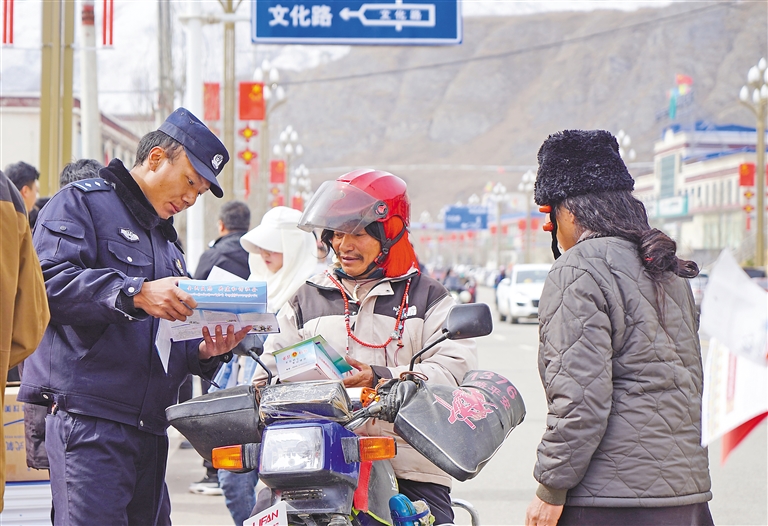 近日,那曲市索縣多舉措開展國家安全教育宣傳活動?!D為那曲市索縣公安局民警向過往群眾講解國家安全知識。記者 萬靖 通訊員 阿旺次仁 攝
