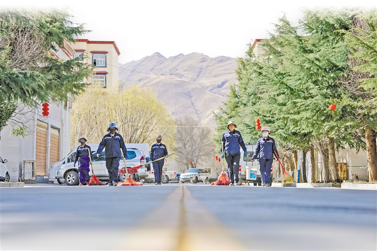 物業(yè)服務(wù)部保潔團(tuán)隊(duì)在清掃小區(qū)道路。記者 阿旺尼瑪 攝