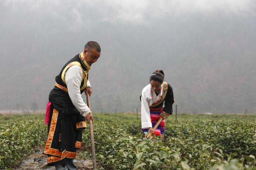 作品簡(jiǎn)介:拍攝于2022年3月松古村茶園,兩位身著藏服的茶農(nóng)正在茶地里辛勤勞作。