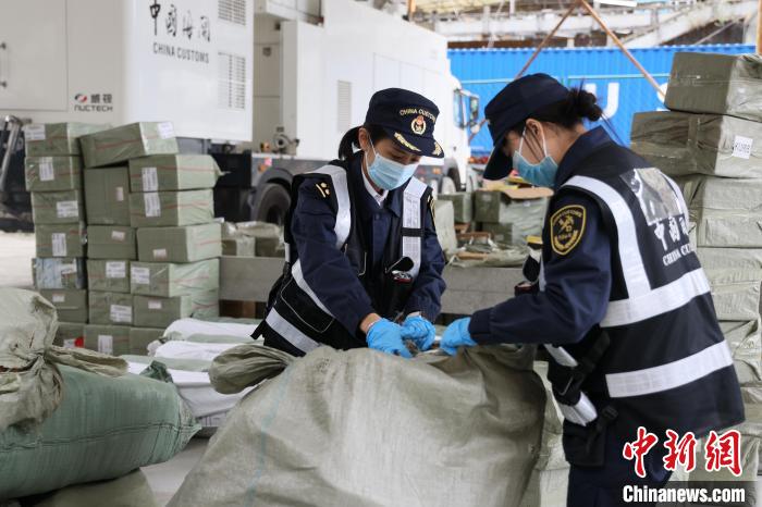 圖為聶拉木海關(guān)關(guān)員對出口貨物進行查驗。拉薩海關(guān)供圖