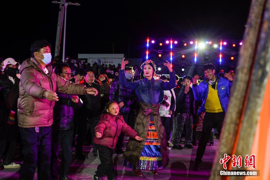 圖為來看賽馬的觀眾圍著篝火跳起鍋莊舞。中新社記者 貢嘎來松 攝