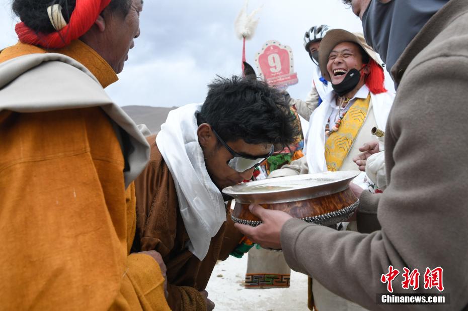 圖為頒獎儀式上馬主喝青稞酒慶祝。中新社記者 貢嘎來松 攝