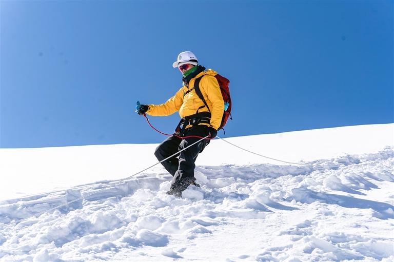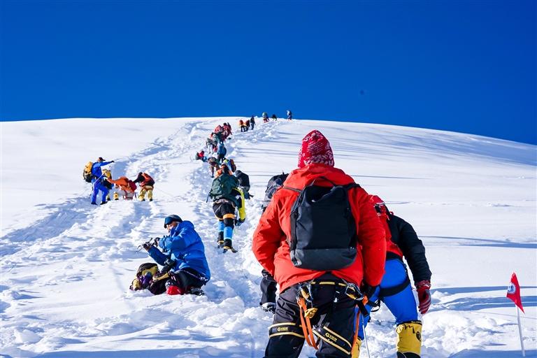 登頂?shù)哪且豢蹋矏傊檠笠缭诿總€(gè)人的臉上,大家紛紛開始拍照留念。第三次登頂?shù)纳接鸭?,難掩激動(dòng)地向記者分享了此次難忘的攀登經(jīng)歷。她提到,在沖頂前一日,教練提醒所有人,因近期頻繁降雪,加之粉雪的特性,今年的攀登路線難度大幅提升。盡管如此,這絲毫沒有削減她的熱情,反而讓她對3日的登頂充滿了期待。