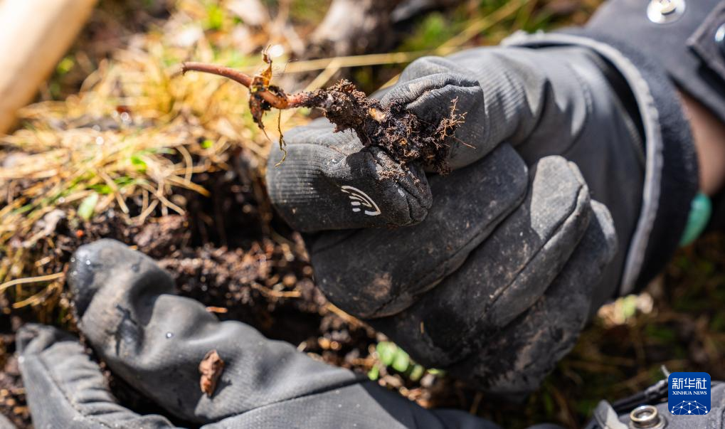 這是在那曲市索縣西昌鄉(xiāng)拍攝的剛采挖出的蟲草(5月18日攝)。新華社記者 丁增尼達 攝