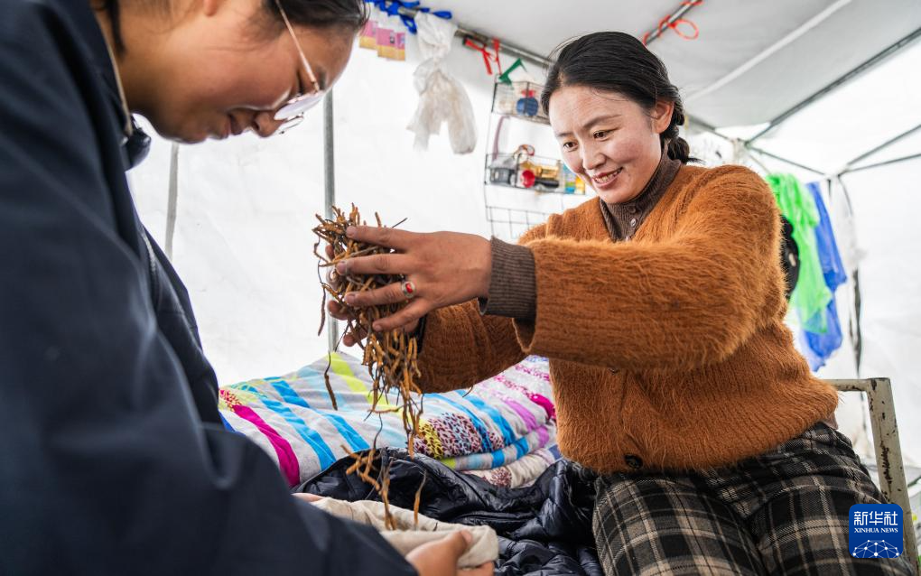 在那曲市索縣西昌鄉(xiāng),牧民將清理好的蟲草裝袋收納(5月18日攝)。新華社記者 丁增尼達 攝