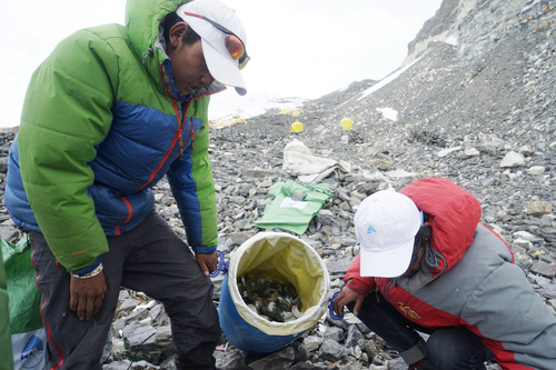 圖為西藏拉薩喜馬拉雅登山向?qū)W校的向?qū)冊谥榉暹M行垃圾清理(2016年5月21日攝)。 新華社發(fā)(扎西次仁攝)