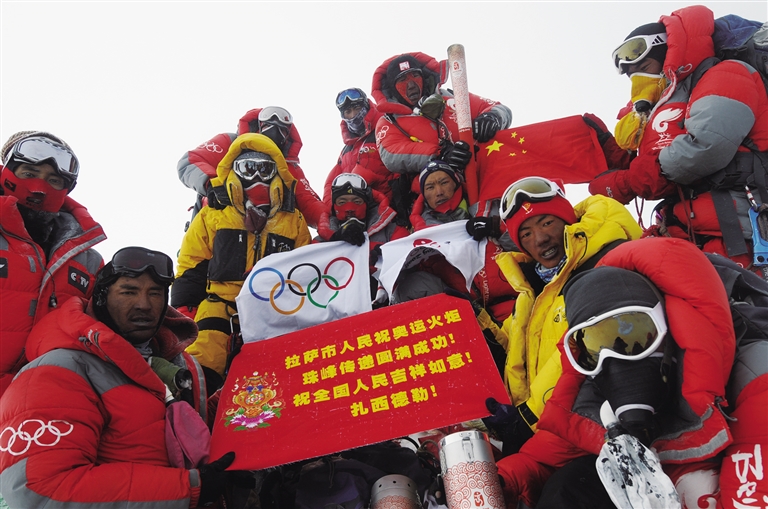 2008年,北京奧運(yùn)火炬在珠峰峰頂傳遞。自治區(qū)體育局供圖。