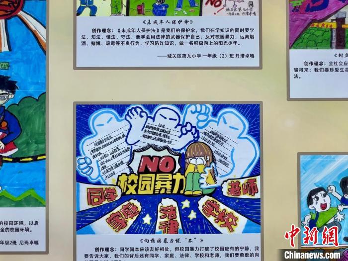 圖為拉薩市檢察院未成年人檢察部走廊里展示的孩子們用畫(huà)筆描繪的法治主題作品。謝牧 攝