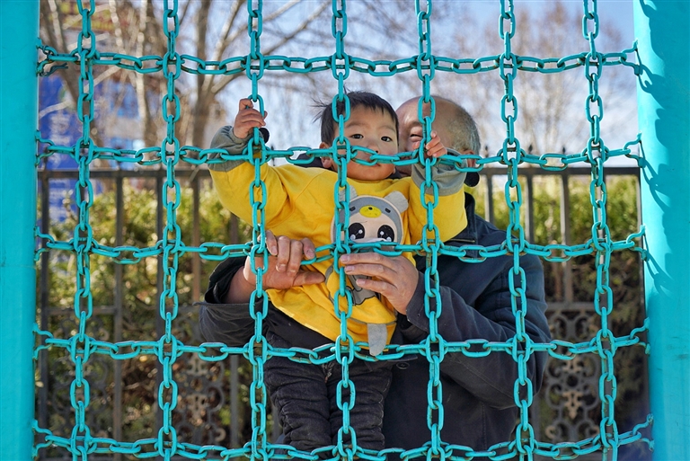 老年人在公園帶著孩子玩耍。