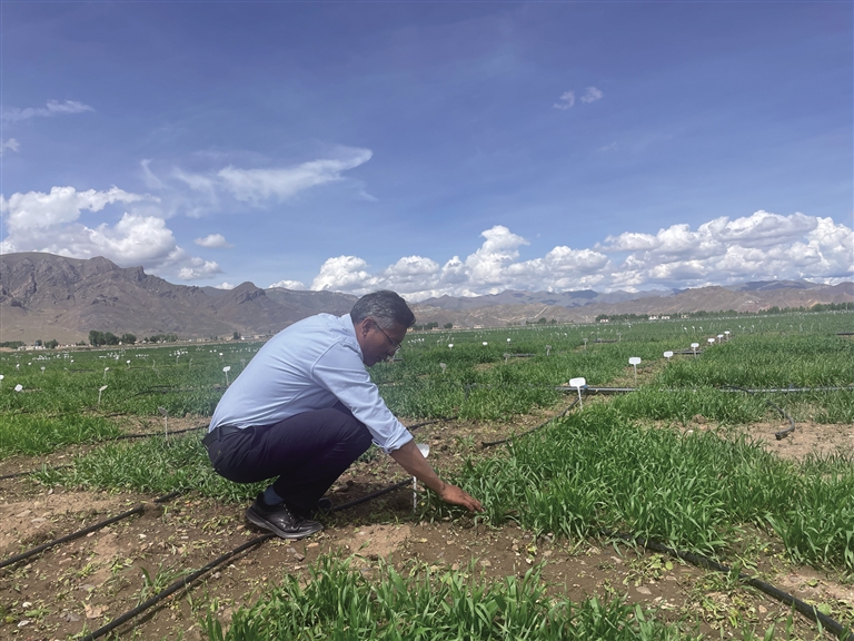 西藏自治區(qū)農(nóng)牧科學(xué)院農(nóng)業(yè)研究所副研究員達(dá)瓦頓珠在田里查看青稞長勢。
