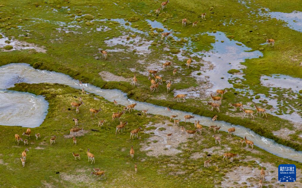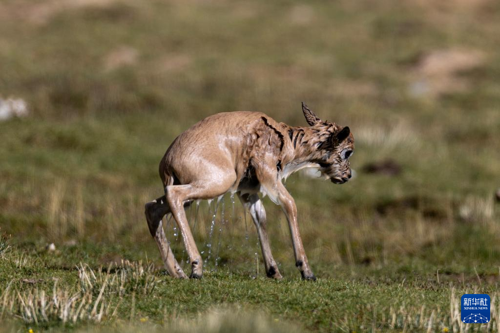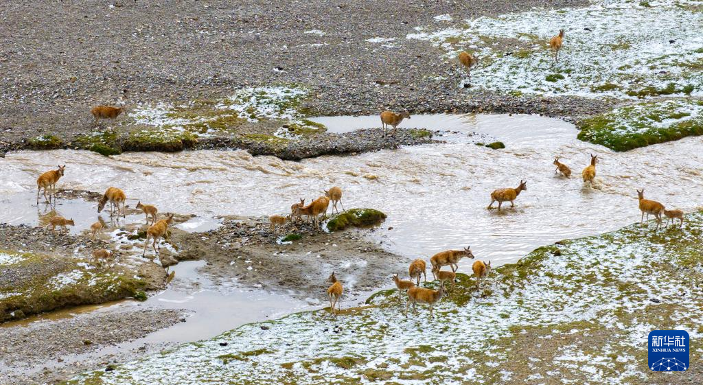 一群帶著幼崽的藏羚羊成功渡過森隆藏布河,幼崽身上水跡未干(7月15日攝)。新華社記者 姜帆 攝?
