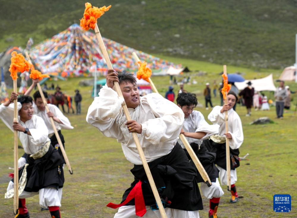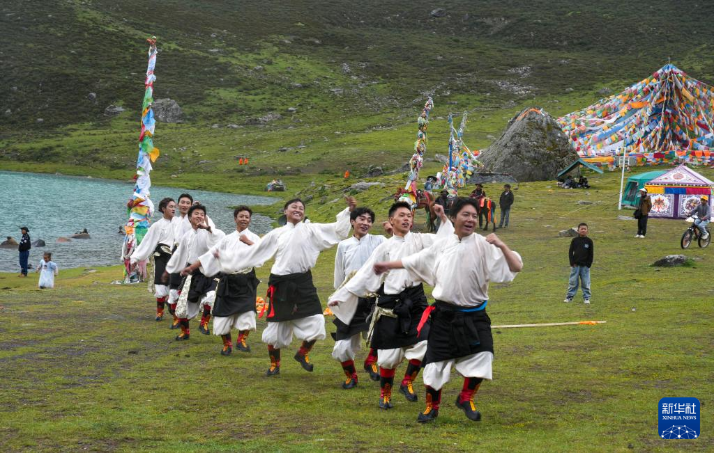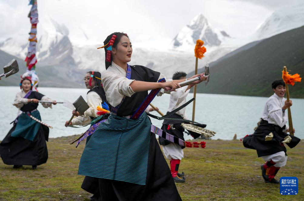 西藏那曲市比如縣藝術(shù)團(tuán)的演員在薩普雪山景區(qū)為游客表演國(guó)家級(jí)非物質(zhì)文化遺產(chǎn)舞蹈“達(dá)布阿諧”(7月19日攝)。這是該藝術(shù)團(tuán)今年在景區(qū)開展的第6場(chǎng)非遺展演活動(dòng)。新華社記者 晉美多吉 攝