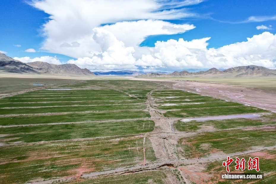 7月20日,航拍西藏阿里地區(qū)革吉縣文布當(dāng)桑鄉(xiāng)的人工種草基地。為解決當(dāng)?shù)囟旧笥貌堇щy,減輕天然草場(chǎng)壓力,2016年起文布當(dāng)桑鄉(xiāng)規(guī)劃建設(shè)人工種草基地。截至2024年,已種植人工草場(chǎng)3590畝,草業(yè)收入229.3萬元人民幣,有效帶動(dòng)當(dāng)?shù)剞r(nóng)牧民就業(yè)創(chuàng)收和推動(dòng)生態(tài)可持續(xù)發(fā)展。(無人機(jī)照片)中新社記者 張祥毅 攝