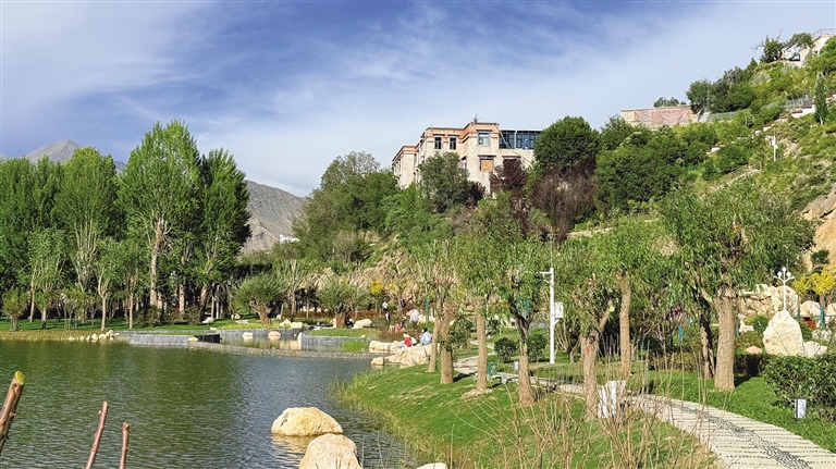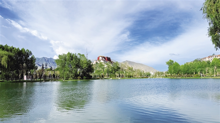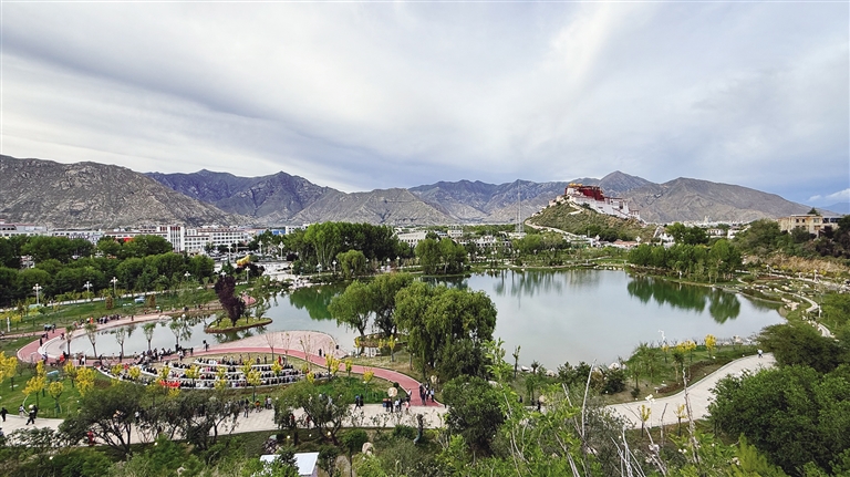 拉薩團(tuán)結(jié)公園坐落于布達(dá)拉宮西麓、藥王山腳下。昔日,這里房屋高低錯雜、線纜交錯密布、市場喧鬧擁擠、環(huán)境喧囂擾攘,不僅影響城市形象和生態(tài)環(huán)境,還影響出行游玩體驗(yàn)。如今,湖水如碧綢般清澈,岸邊綠樹成蔭,各類花卉競相綻放,昔日雜亂之地已蛻變?yōu)轸浯涿髦?,人文古跡與自然景致相映成趣,共同繪就出“百澤繞城·水城相依”的生態(tài)文明畫卷。