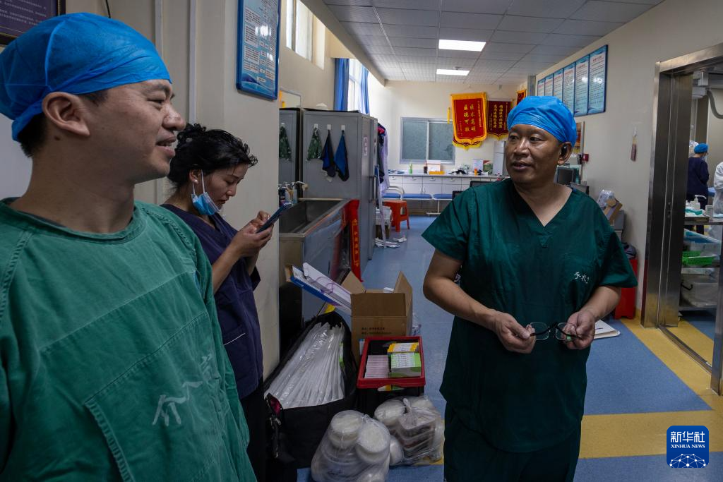 協(xié)和醫(yī)院第十批援藏醫(yī)生王強(qiáng)(左二)、第十一批援藏醫(yī)生蔣青偉(右二)和西藏自治區(qū)人民醫(yī)院醫(yī)生旦增索朗(左一)在手術(shù)室外監(jiān)控指揮手術(shù)(8月5日攝)。新華社記者 姜帆 攝