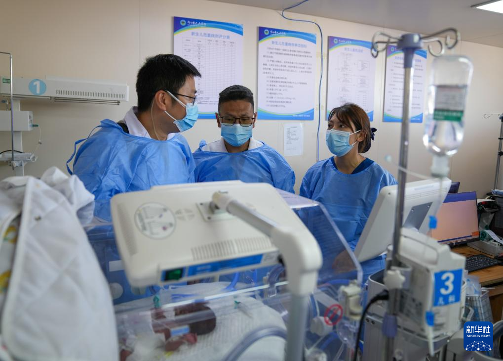 在那曲市人民醫(yī)院新生兒重癥監(jiān)護(hù)室,來自大連醫(yī)科大學(xué)附屬第一醫(yī)院的援藏醫(yī)生田聰亮(左)與吉美多布杰(中)、護(hù)士旦珍合作,為一名早產(chǎn)兒實(shí)施機(jī)械通氣治療(7月18日攝)。吉美多布杰2003年從四川大學(xué)華西醫(yī)學(xué)院畢業(yè)來到那曲市人民醫(yī)院工作,他先后和8批援藏專家合作、學(xué)習(xí)。新華社記者 晉美多吉 攝