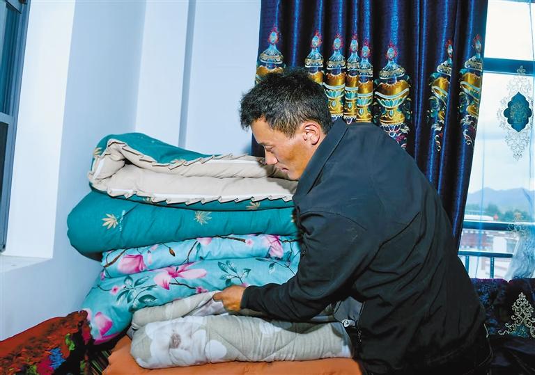 定日縣森嘎村首批入住村民在新家整理被子。記者王敏 攝