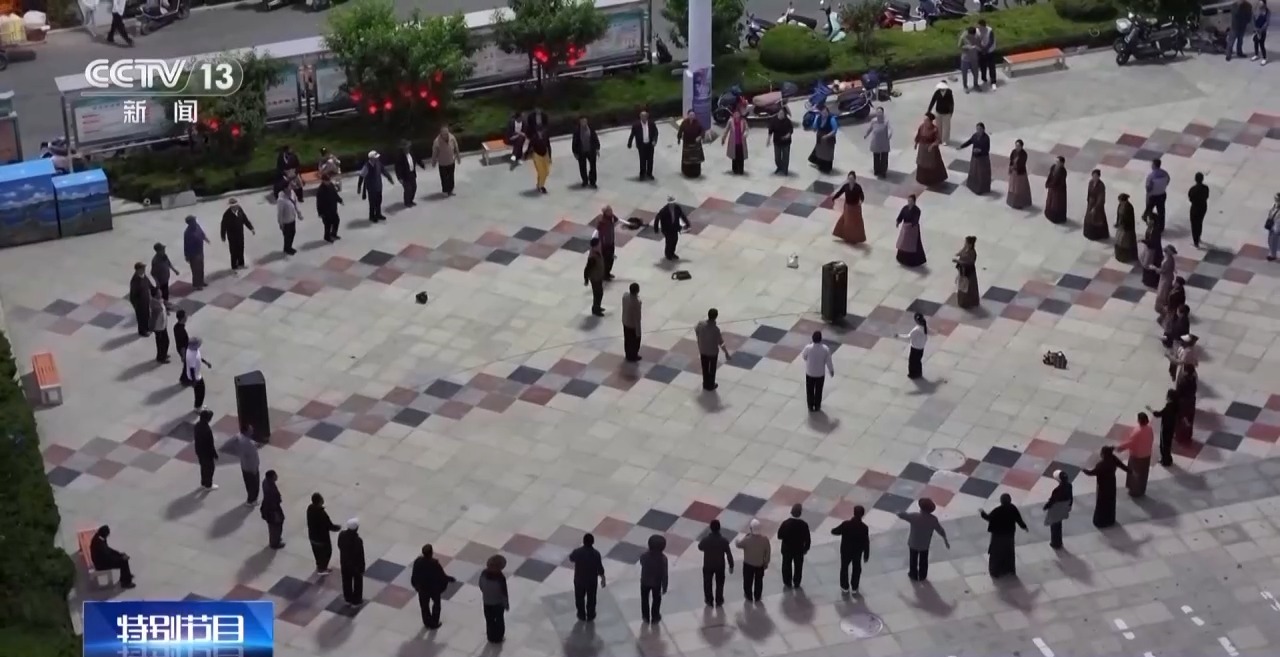 傍晚時(shí)分,社區(qū)居民吃過(guò)晚飯就會(huì)來(lái)到廣場(chǎng),圍在一起跳起藏式廣場(chǎng)舞“鍋莊”。