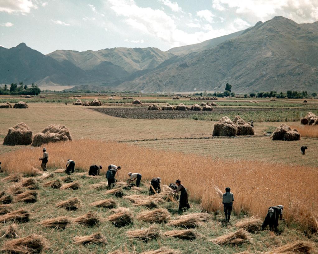 1965年8月,林芝縣(現(xiàn)為林芝市)立定鄉(xiāng)組織農民收割青稞。新華社記者 馬競秋 攝