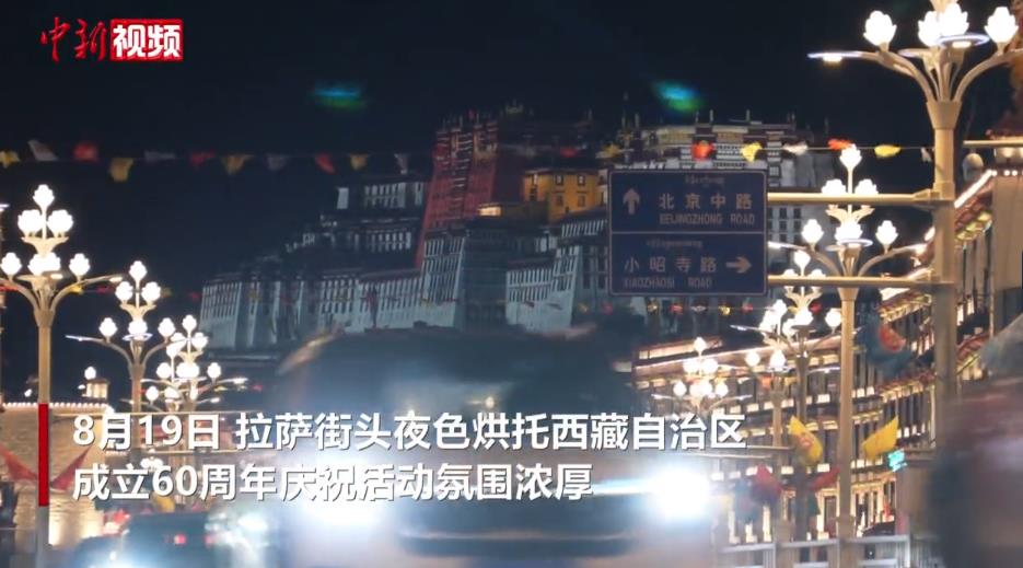 8月19日,拉薩街頭夜色烘托西藏自治區(qū)成立60周年慶祝活動(dòng)氛圍濃厚。隨著西藏自治區(qū)成立60周年慶?;顒?dòng)臨近,拉薩街頭彩旗飄揚(yáng)、人行天橋裝扮一新、燈光秀炫彩奪目,處處洋溢著一派祥和歡慶的氣氛。(李林 旦增卓瑪 制作 王嘉怡)