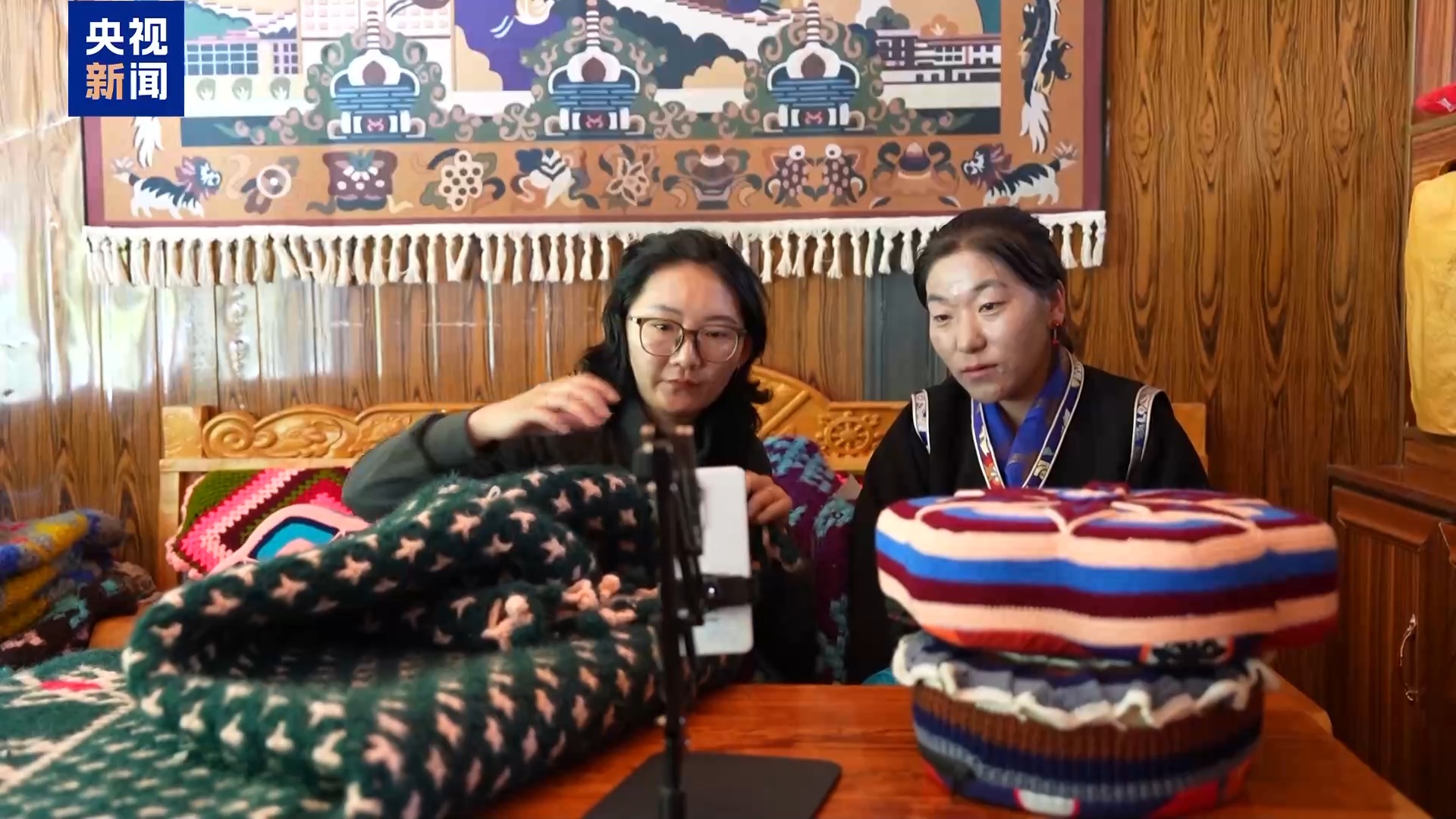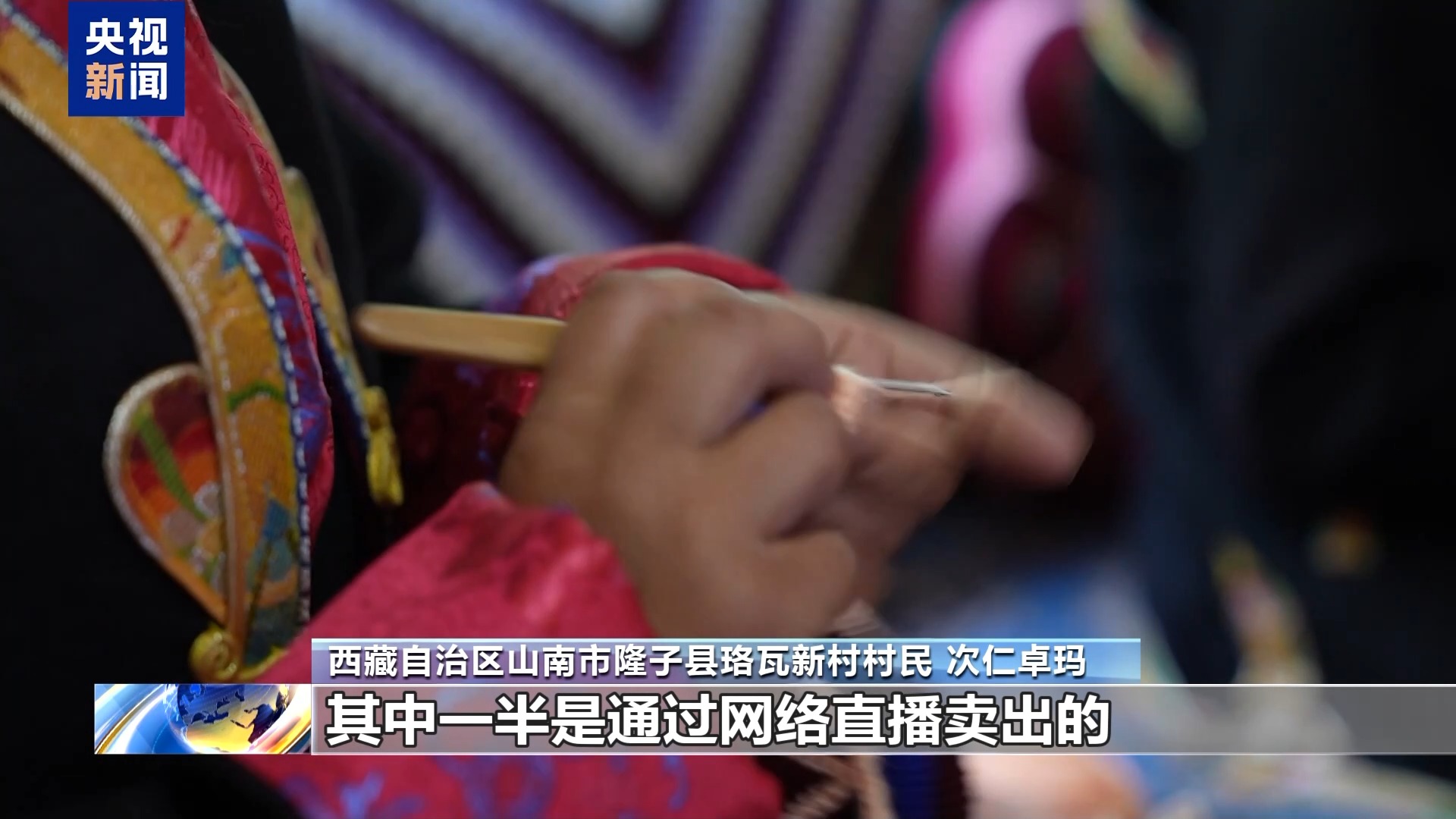 西藏自治區(qū)山南市隆子縣珞瓦新村村民 次仁卓瑪:今年以來,我們已經賣出了50多條毛毯,100多個靠枕,其中一半是通過網(wǎng)絡直播賣出的。