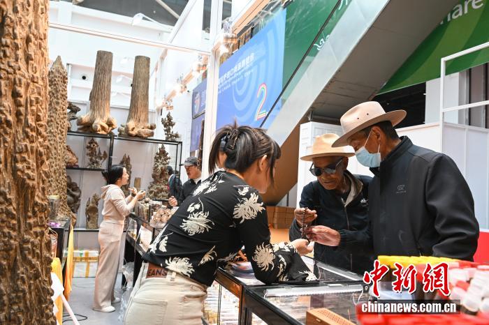 2025年5月16日,2025第二屆拉薩進(jìn)口商品展覽會(huì)在西藏會(huì)展中心舉行。圖為越南商人(左)向顧客推銷佛珠。中新社記者 貢嘎來(lái)松 攝