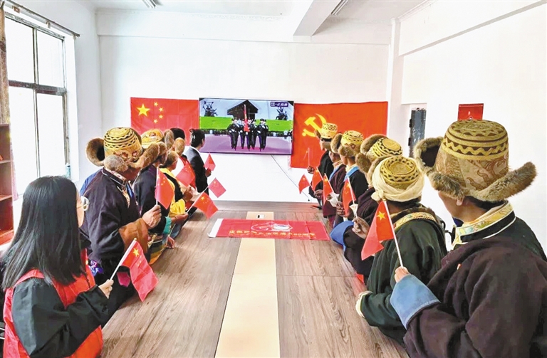 在阿里地區(qū)噶爾縣扎西崗鄉(xiāng)典角村,57歲的次仁久美和家人一同觀看慶祝大會(huì)盛況,熱烈的氛圍感染著屋里的每一個(gè)人?!耙郧拔覀冏〉氖鞘^泥土壘的房子,漏風(fēng)又漏雨,后來換成了土木房,可還是抵不住冬天的寒風(fēng)。現(xiàn)如今,鋼筋混凝土的房子亮堂又暖和?!贝稳示妹勒f,“好日子是黨給的!作為一名黨員,我要帶著大家一起,不僅把日子過得紅火,更要守好祖國的每一寸土地?!?/p>