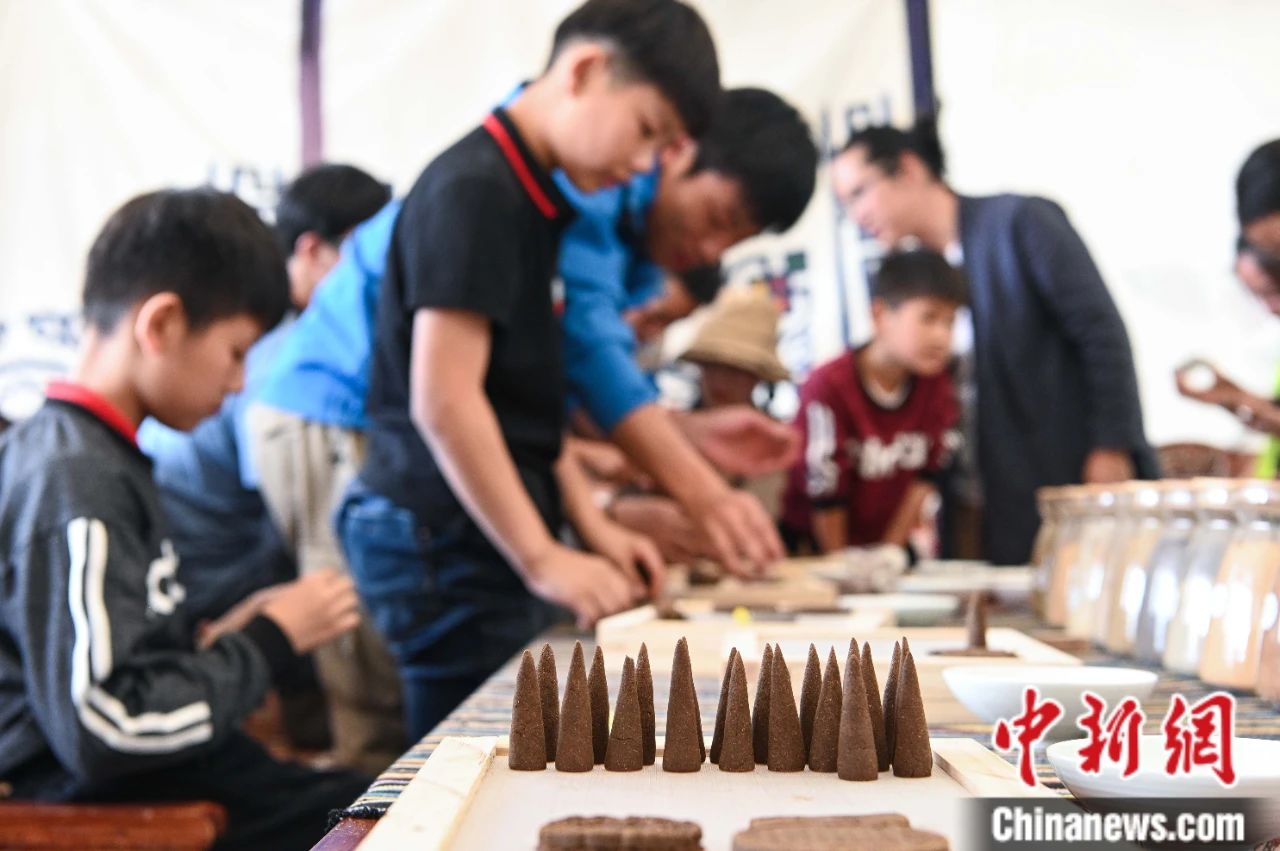 圖為2019年7月6日,來自江蘇蘇州的小游客們?cè)诘录丶殷w驗(yàn)藏香手作。中新社記者 何蓬磊 攝